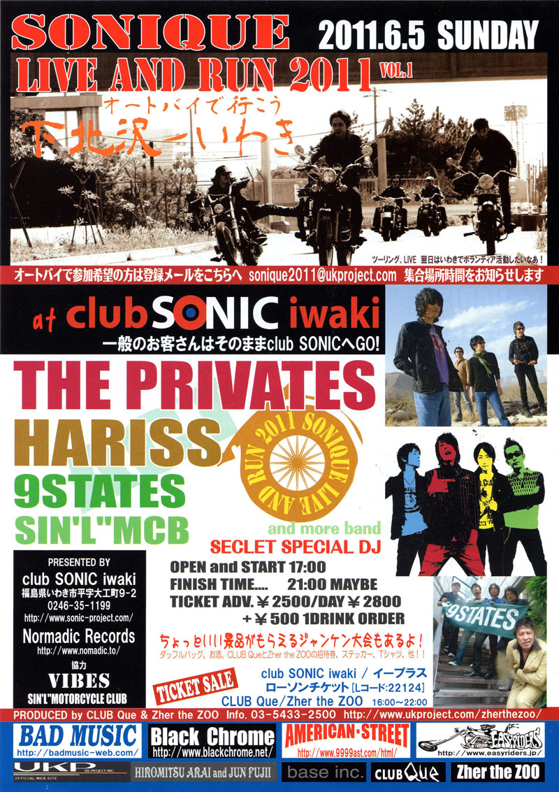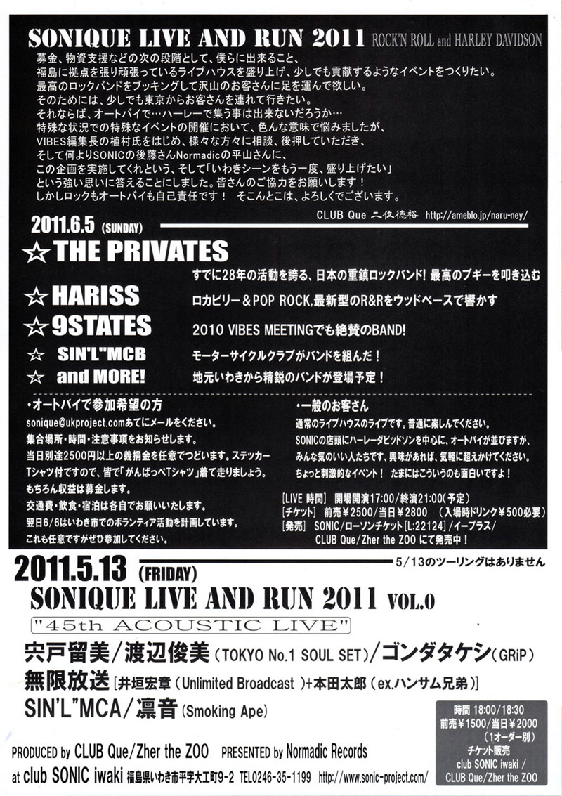 retweet4月上旬に福島県富岡町のレーベルオーナーより相談を受けました。 「いわき市」で何かイベントをやって貰えないか... 募金、物資支援などの次の段階として、僕らに出来ること、ライブハウスを盛り上げ、少しでも貢献する様なイベントをつくりたい。 イベントの開催において、色んな意味で悩みましたが、VIBES編集長の植村氏をはじめ、他の方々に相談にのっていただき、 しかしロックもオートバイも自己責任です! そこんとこは、よろしくでございます。 |